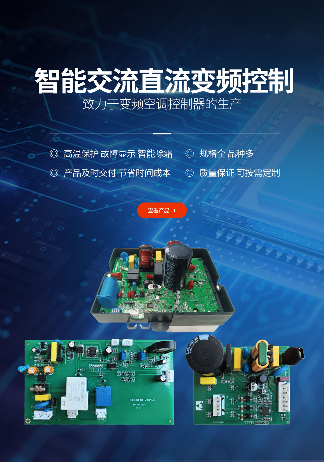 公司目前有數(shù)十種專利,并具備生產(chǎn)及工藝技術(shù)。年產(chǎn)家電控制器一百萬(wàn)套,產(chǎn)品廣泛用于空調(diào)、中央空調(diào)、電熱水器、